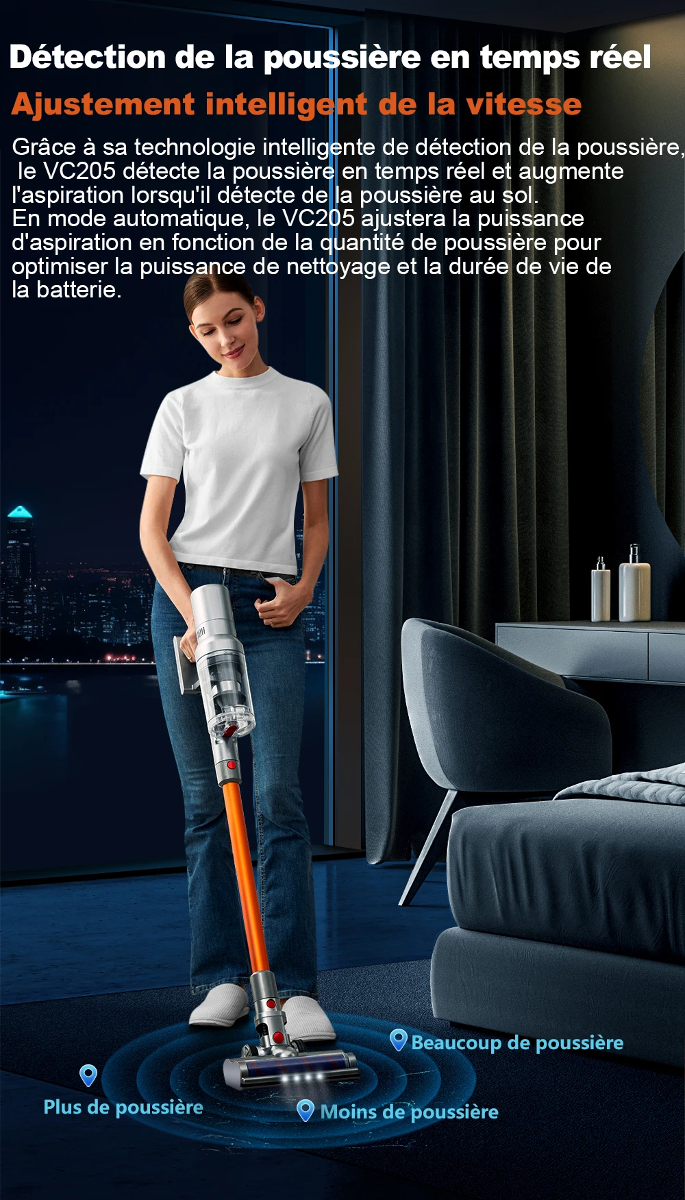 1. Grâce à la technologie intelligente de détection de poussière, le VC205 détectera la poussière en temps réel, augmentera l'aspiration lors de la détection de la poussière du sol. Il réglera également automatiquement l'aspiration en fonction du volume de poussière pour optimiser l'efficacité du nettoyage et la durée de vie de la batterie.