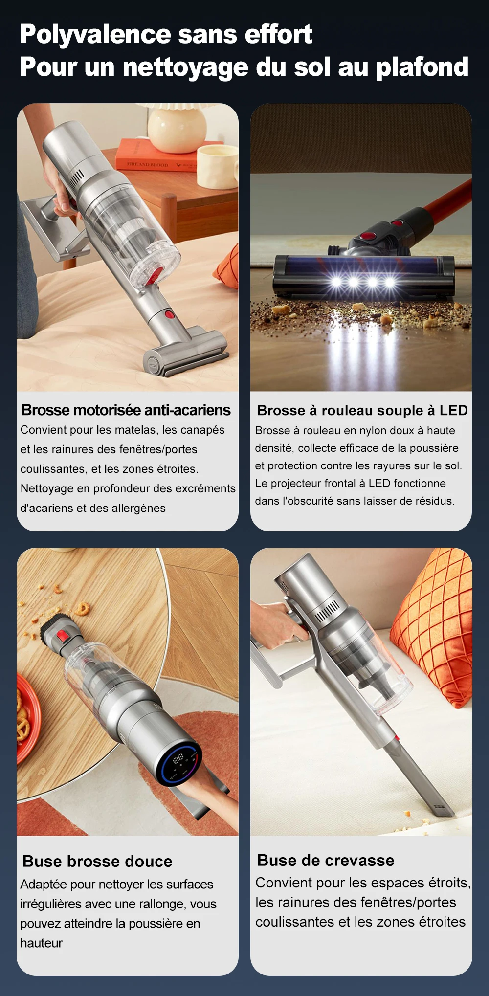 4. Avec brosse spéciale anti-acariens, brosse douce 2 en 1, brosse de sol avec lumière LED, suceur plat. 4 types de têtes de brosse pour répondre à toutes vos exigences.