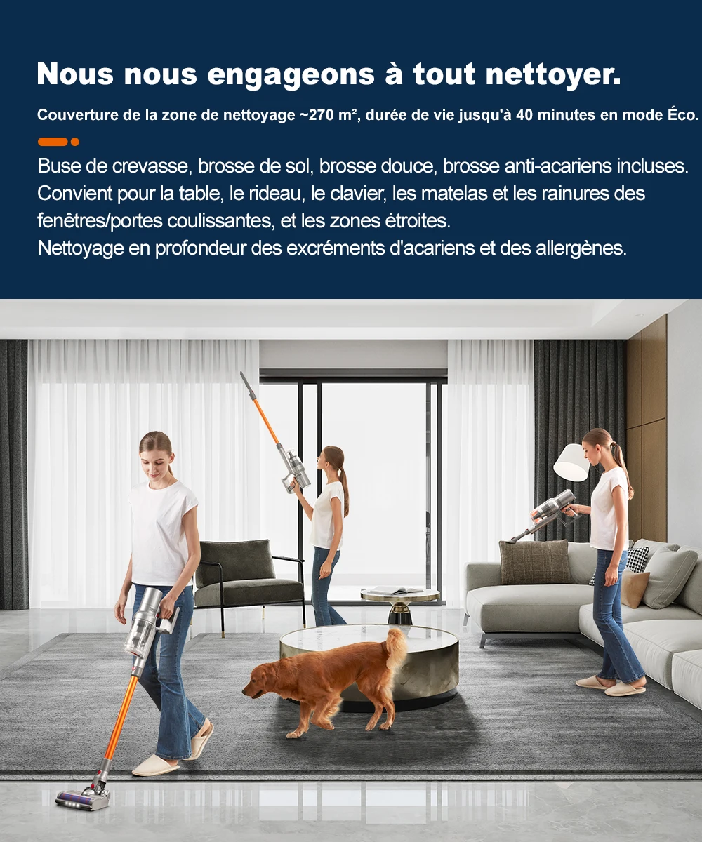 3.Avec une puissance maximale de 27000Pa, cet aspirateur est capable d'extraire les particules invisibles nichées dans les moindres recoins, bien plus puissant que les autres marques.