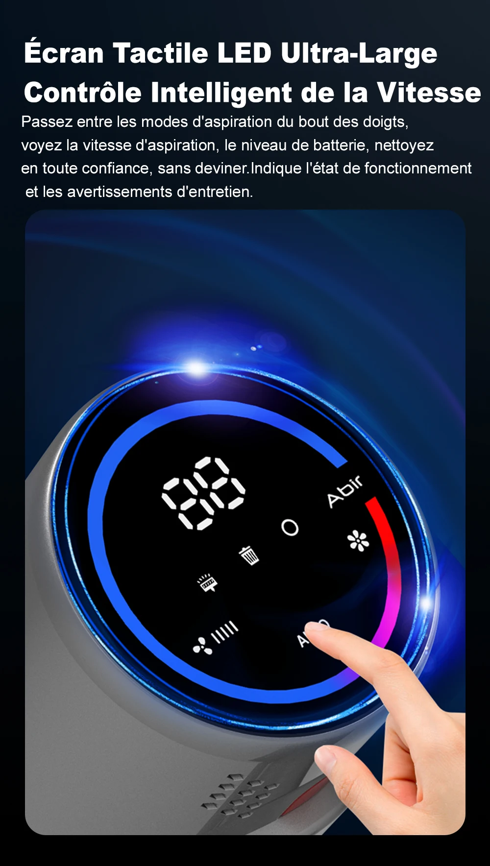 4.Un écran tactile LED ultra-large permet de basculer entre les modes d'aspiration d'un simple effleurement, affichant la vitesse d'aspiration, le niveau de batterie et assurant un nettoyage précis sans aucune devinette.