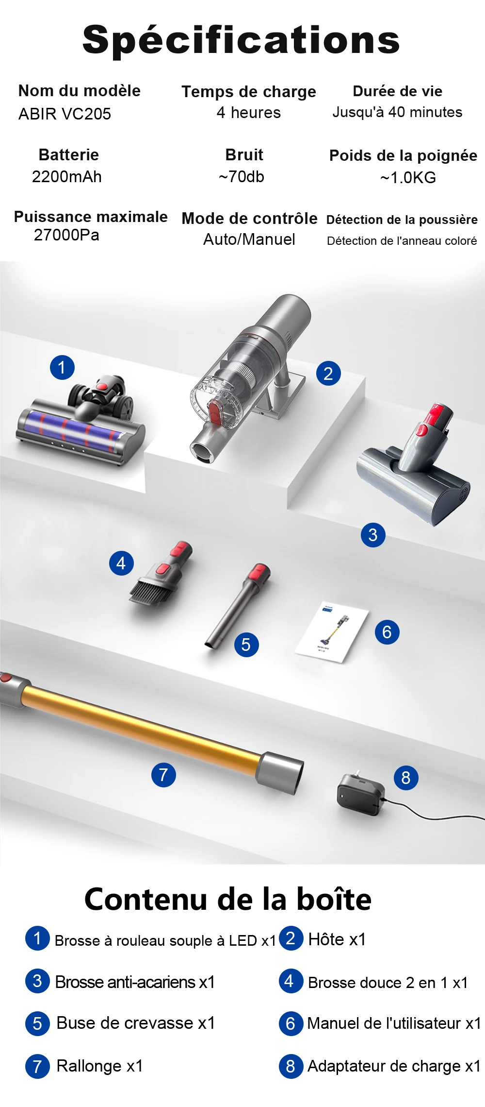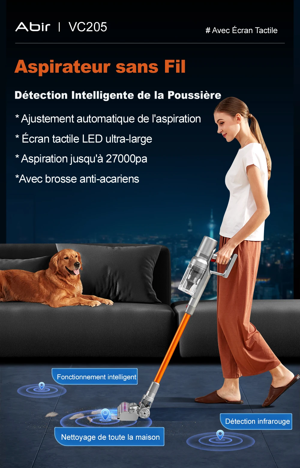 ABIR-aspirateur sans fil VC205, 27000PA, poignées anti-poussière intelligentes, grand écran tactile, pour la maison des animaux domestiques