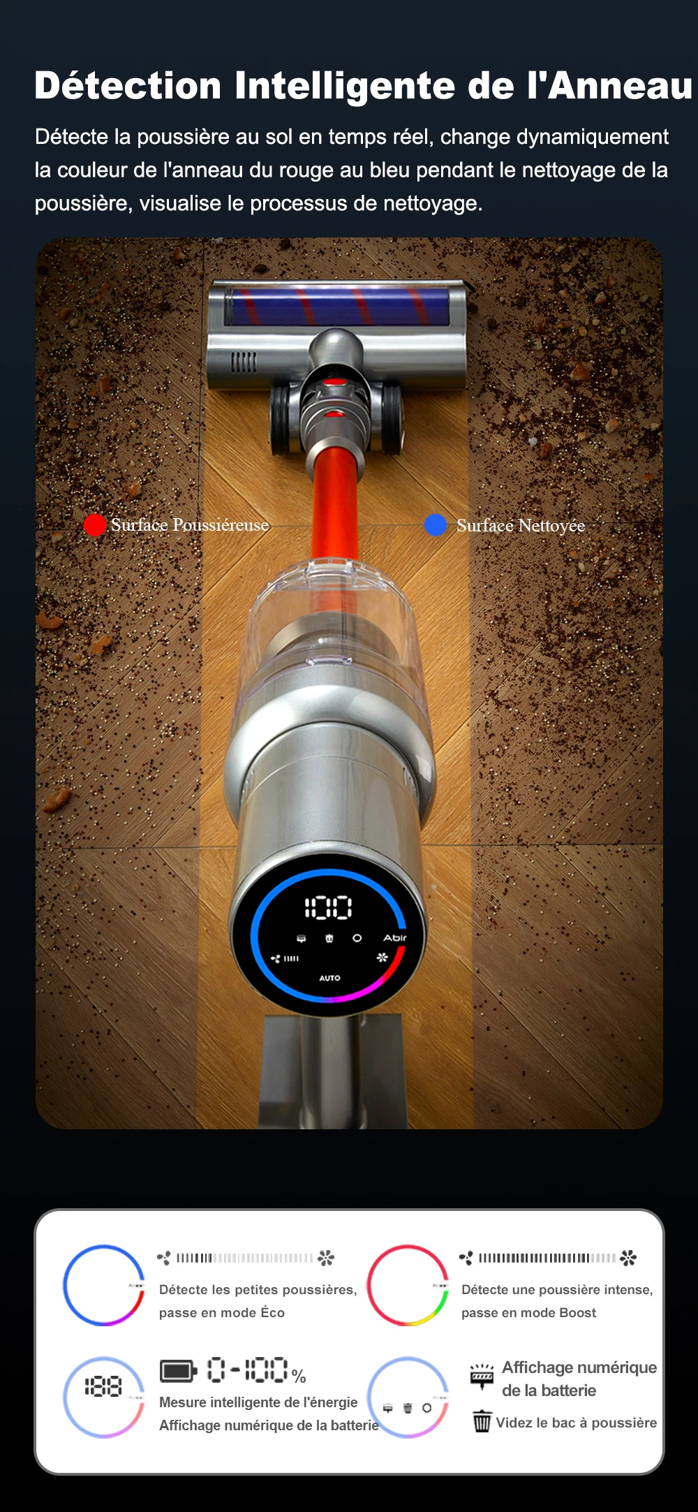 3. Lorsque vous aspirez la poussière, la couleur de l'anneau passe du rouge au bleu pendant le nettoyage de la poussière, visualisez le processus de nettoyage.