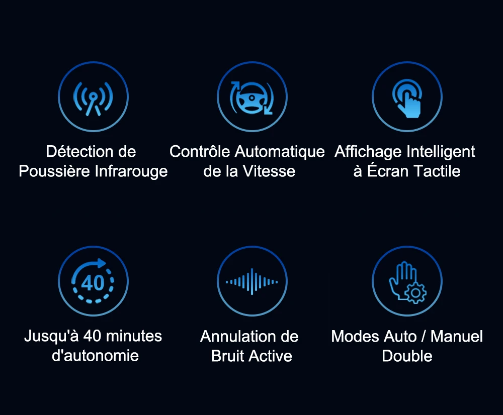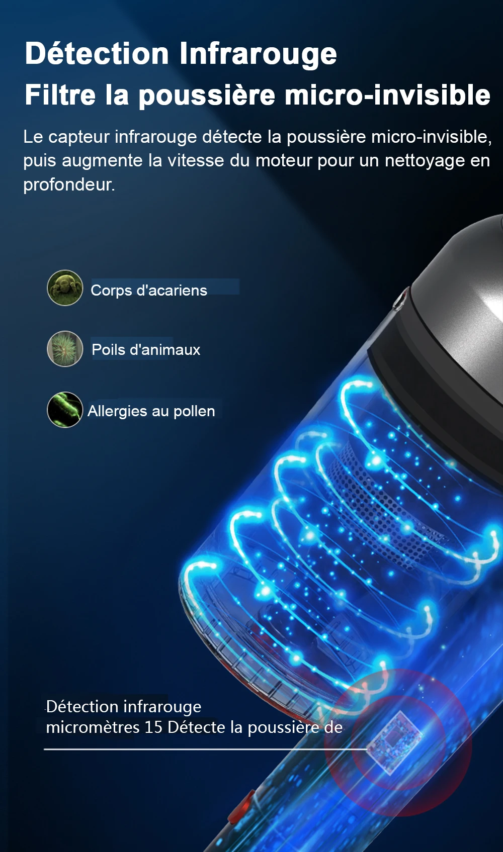 1.La détection infrarouge de la poussière permet de détecter et de mesurer les particules microscopiques, augmentant intelligemment la vitesse du moteur.